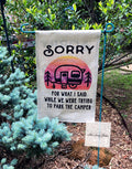 Camping Garden Flag Sorry For What I Said While We Were Trying To Park The CamperThis burlap garden flag is double sided with a grunge sunset background and black camper design with the popularphrase: Sorry For What I Said While...